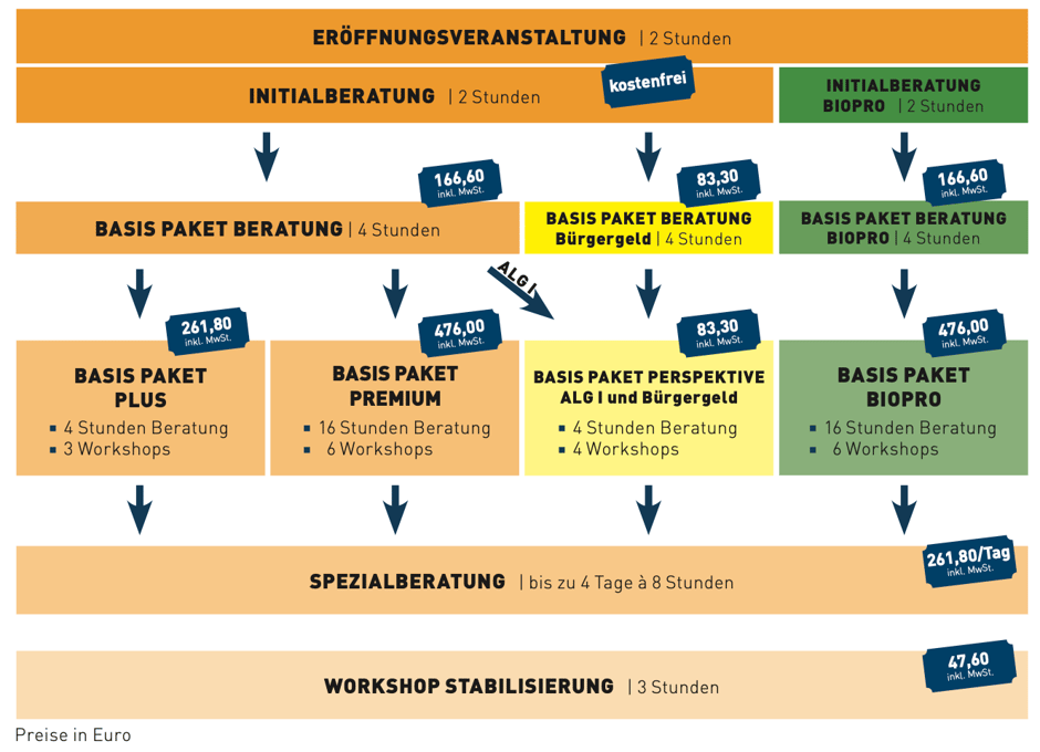Zunächst stellt ihr einen Antrag auf EXI-Gutscheine. Nach positivem Bescheid erfahrt ihr gemeinsam mit anderen Gründungsinteres-sierten an der Eröffnungs-veranstaltung mehr über das Programm. Mit mir als eurem Wunschberater geht es dann bereits in die kostenfreie Initialberatung. Erst dann beantragt ihr das kosten-pflichtige Basis Paket oder - wenn ihr schon wisst, dass ihr mehr Beratung braucht - gleich mehrere Pakete. Die weiteren Pakete beinhalten neben individueller Beratungszeit auch die Teilnahme an drei bzw. sechs Workshops zu wichtigen Themen. Eine Spezialberatung kann folgen. Bei Bedarf ziehe ich selbst andere Berater-Kolleg*innen hinzu.